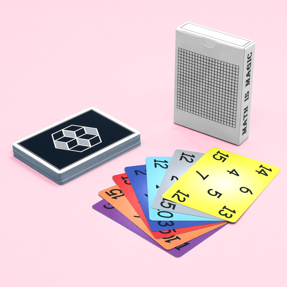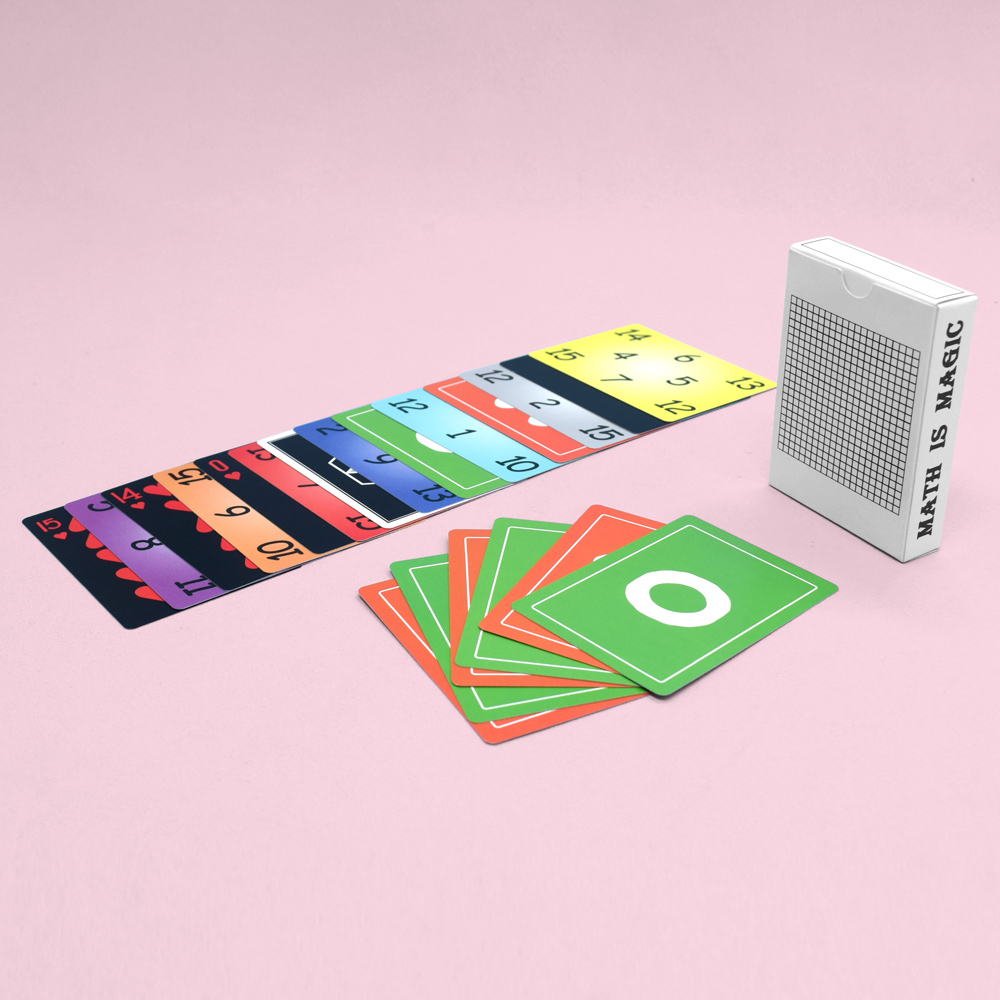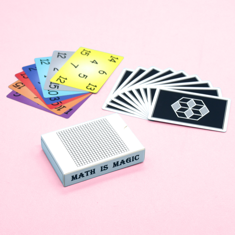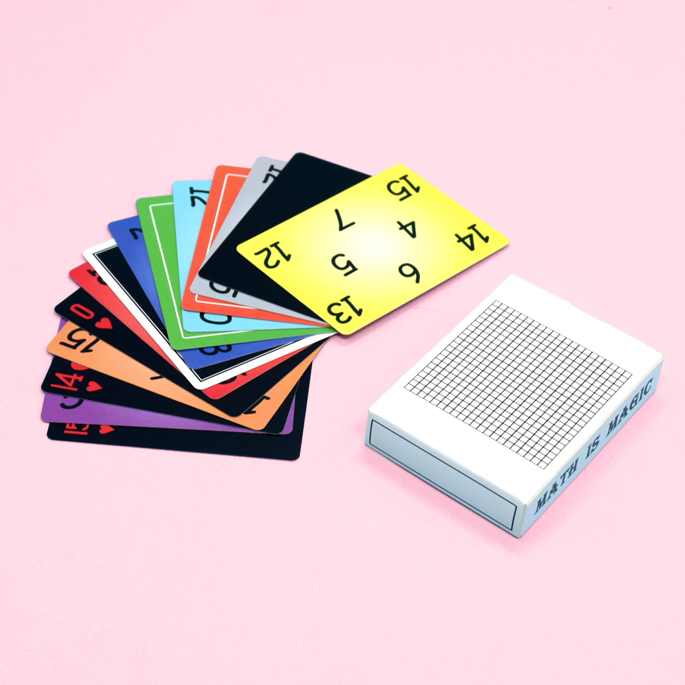 - Math-Themed Design: The cards feature a playful and bright design with bold colors and number patterns. The back of each card has a unique grid pattern with the phrase "Math is Magic," adding a whimsical touch to the game. The front of the cards is filled with different numbers and colors, each representing a specific element of the gameplay.