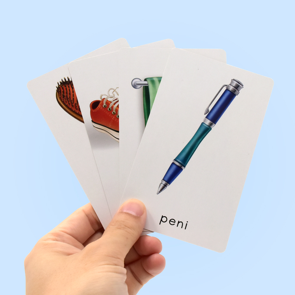 - Illustrations of Common Items: Each card features a detailed illustration of a daily object, such as a pen, apple, book, or cup. These images are designed to be easily recognizable, helping users connect the objects with their names.